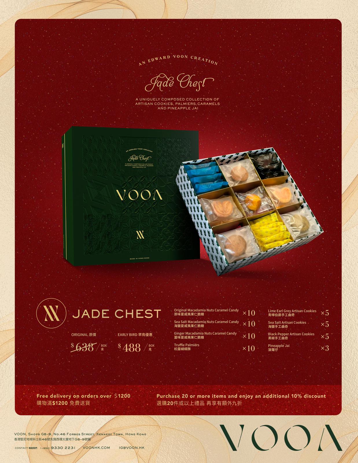 Celebrate the Lunar New Year with VOON’s festive puddings, featuring Pepper Crab Turnip Pudding, Osmanthus Water Chestnut Pudding, Pandan Coconut Pudding, and exquisite festive gift box - Jade Chest. All items are handcrafted in Hong Kong with quality ingredients. Every item is handcrafted in Hong Kong with premium ingredients. Various combos are available to meet your preferences!